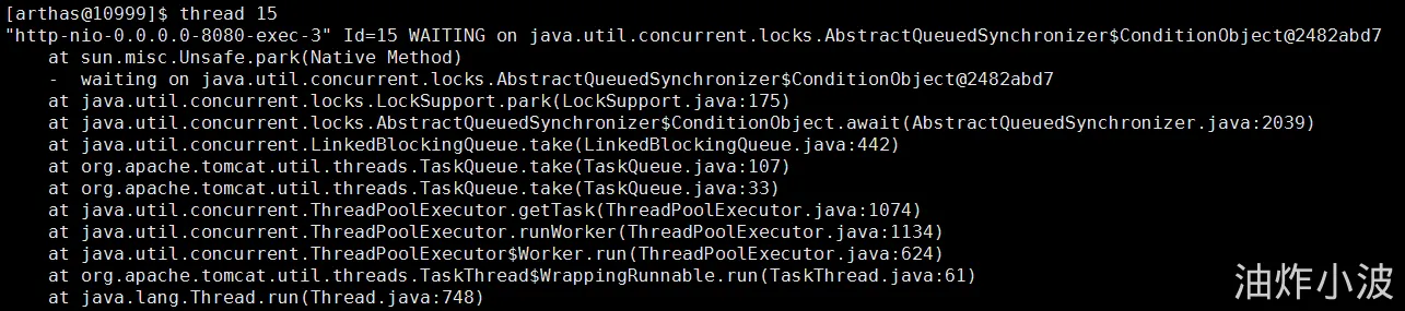 他的大致意思就是:线程在等待一个条件从而继续执行,可以看到方法是在执行LinkedBlockingQueue.take方法时候,查看这个方法的API提示如下: