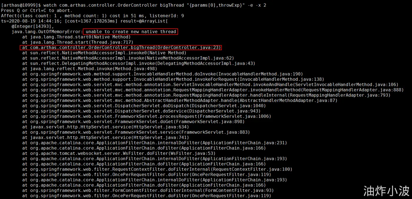 [arthas@10999]$ trace com.arthas.controller.OrderController bigThread Press Q or Ctrl+C to abort. Affect(class count: 1 , method count: 1) cost in 53 ms, listenerId: 10 `---ts=2020-08-19 14:45:57;thread_name=http-nio-0.0.0.0-8080-exec-10;id=16;is_daemon=true;priority=5;TCCL=org.springframework.boot.web.embedded.tomcat.TomcatEmbeddedWebappClassLoader@1f1c7bf6 `---[1452.684406ms] com.arthas.controller.OrderController:bigThread() [throws Exception] +---[0.168814ms] com.arthas.service.ArthasService:test() #20 `---throw:java.lang.OutOfMemoryError #-2 [unable to create new native thread]