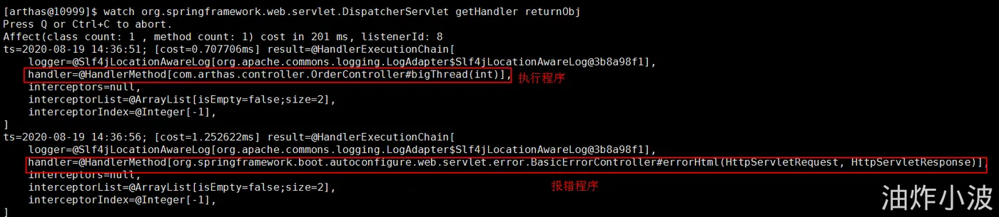 `---ts=2020-08-19 15:52:02;thread_name=http-nio-0.0.0.0-8080-exec-3;id=f;is_daemon=true;priority=5;TCCL=org.springframework.boot.web.embedded.tomcat.TomcatEmbeddedWebappClassLoader@1f1c7bf6 `---[5.609405ms] com.arthas.controller.OrderController:bigThread() `---[0.204675ms] com.arthas.service.ArthasService:test() #20 `---ts=2020-08-19 15:52:04;thread_name=http-nio-0.0.0.0-8080-exec-4;id=10;is_daemon=true;priority=5;TCCL=org.springframework.boot.web.embedded.tomcat.TomcatEmbeddedWebappClassLoader@1f1c7bf6 `---[3.900149ms] com.arthas.controller.OrderController:bigThread() `---[0.14636ms] com.arthas.service.ArthasService:test() #20 `---ts=2020-08-19 15:52:04;thread_name=http-nio-0.0.0.0-8080-exec-5;id=11;is_daemon=true;priority=5;TCCL=org.springframework.boot.web.embedded.tomcat.TomcatEmbeddedWebappClassLoader@1f1c7bf6 `---[1.90945ms] com.arthas.controller.OrderController:bigThread() `---[0.147353ms] com.arthas.service.ArthasService:test() #20