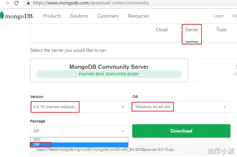 (1)先到官网下载压缩包 mongod-linux-x86_64-4.0.10.tgz 。