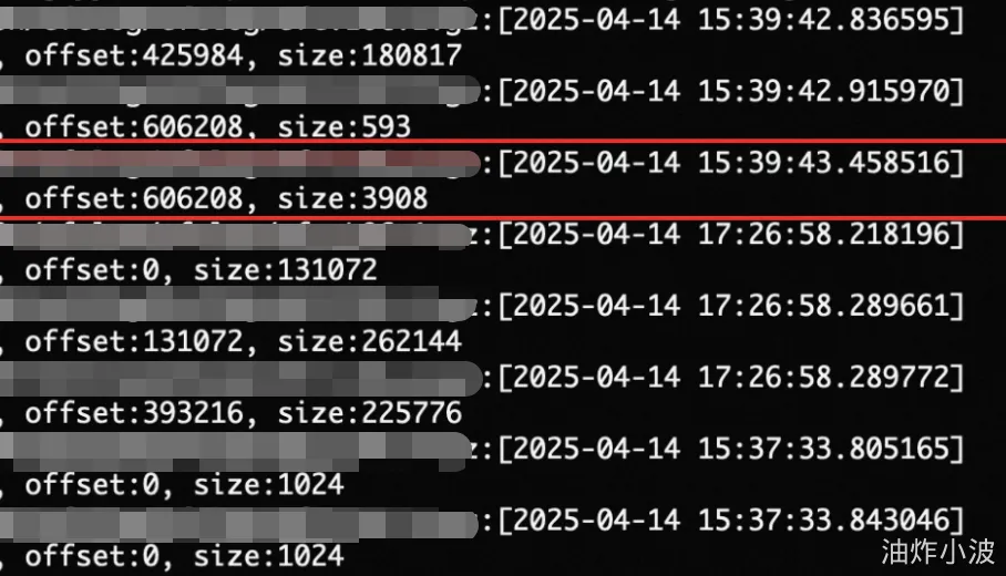 在整个 CTO 测试期间,分析 EFC 缓存的日志,存在 6 条读缓存日志,并且命中缓存的仅有 3 条,错误也就发生在这 3 次读操作中。结合错误数据的 start offset (606208) 和 end offset (606208 + 3908 = 610116) 最终可以定位到第 3 次的读操作出错(606208 < 606800 < 610018 < 610116)。
