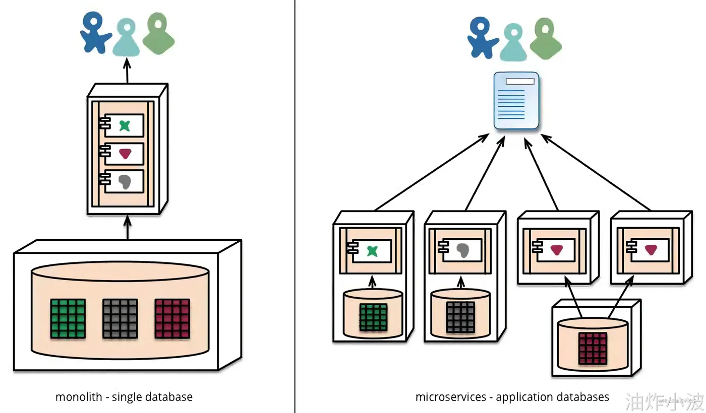 如上图左侧为单体应用架构。在传统单体应用中,所有功能模块都在一个工程中编码、部署,即使是集群部署,也只是单体应用的水平复制。