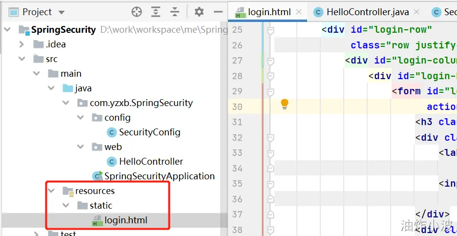 简介: 本文介绍Spring Security前后端整合配置:前端提供login.html登录页面,后端通过HelloController定义接口,SecurityConfig配置类实现表单登录认证,包括登录页、参数名、成功失败跳转等,并禁用CSRF。启动后访问/demo/index可验证登录拦截与跳转功能。