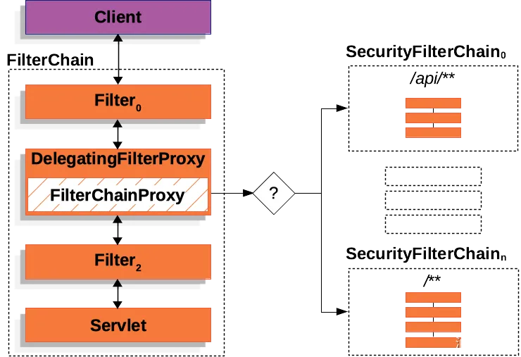 Spring Security 的 Servlet 支持包含在FilterChainProxy。FilterChainProxy是 Spring Security 提供的特殊功能Filter,允许Filter通过 委托给许多实例SecurityFilterChain。由于FilterChainProxy是一个 Bean,因此它通常包装在DelegatingFilterProxy中。