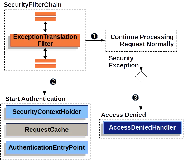 - 否则,如果它是AccessDeniedException,则Access Denied。调用AccessDeniedHandler来处理拒绝访问。