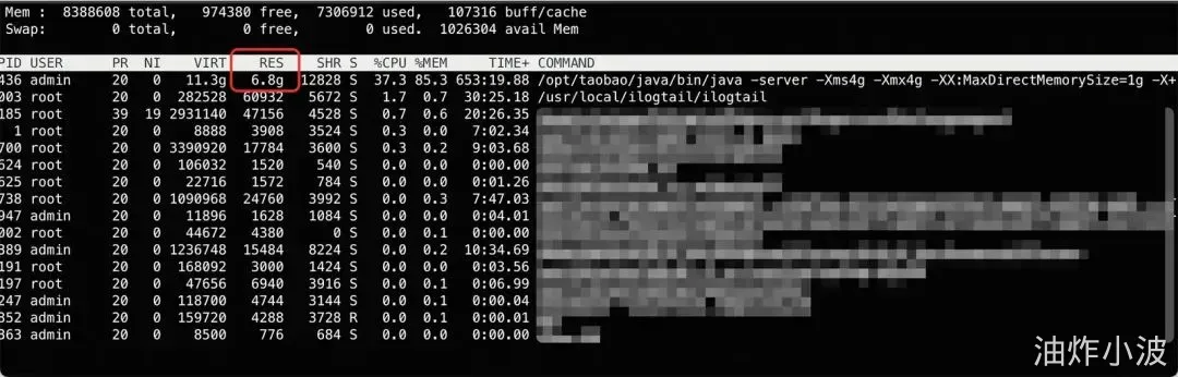 通过目前掌握到的信息来看,4G(Java堆)+1G(堆外)+512M(元空间)+250M(CodeCache)+其它,离6.8G还是有不少差距,无法简单的明确原因,需要深入排查分析了。
