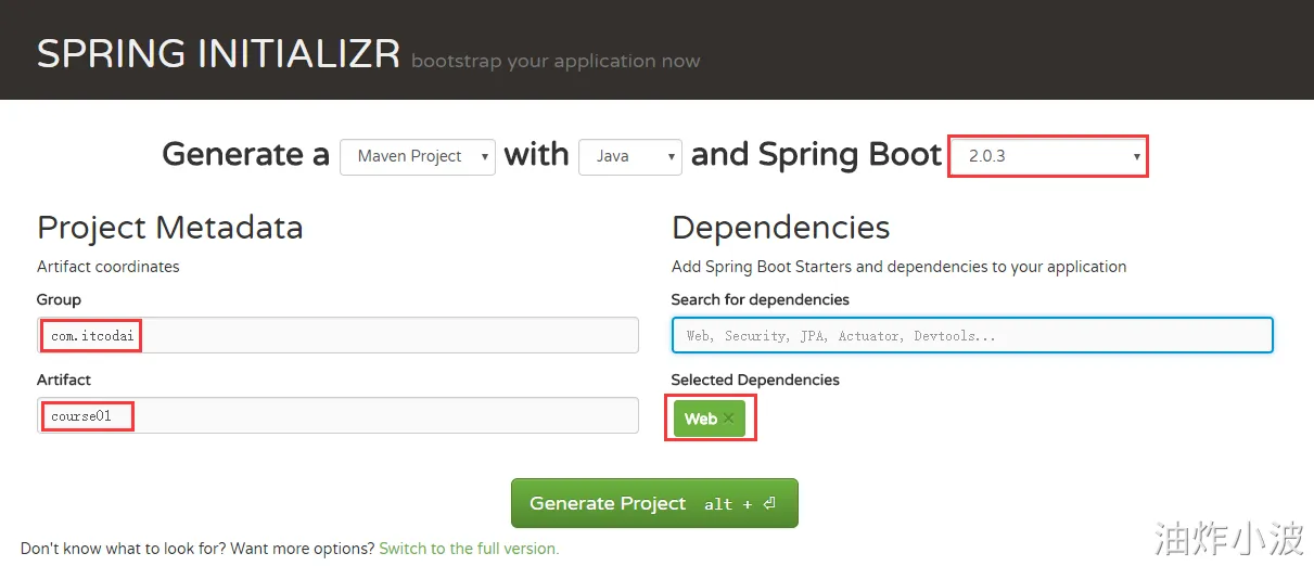 course+课号命令,这里使用 course01 - Dependencies:可以添加我们项目中所需要的依赖信息,根据实际情况来添加,本课程只需要选择 Web 即可。