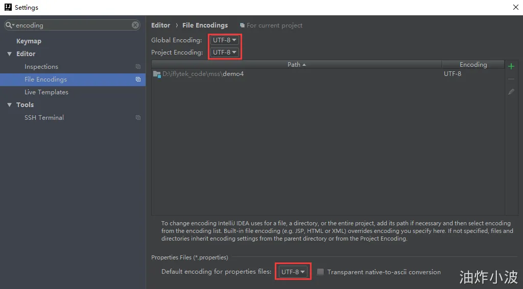 IDEA 中,仍然是打开File->settings,搜索 encoding,配置一下本地的编码信息。如下: