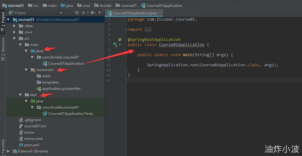 默认情况下,如上图所示会创建一个启动类 Course01Application,该类上面有个@SpringBootApplication注解,该启动类中有个 main 方法,没错,Spring Boot 启动只要运行该 main 方法即可,非常方便。另外,Spring Boot 内部集成了 tomcat,不需要我们人为手动去配置 tomcat,开发者只需要关注具体的业务逻辑即可。