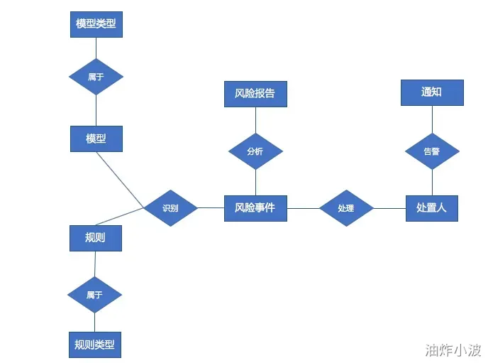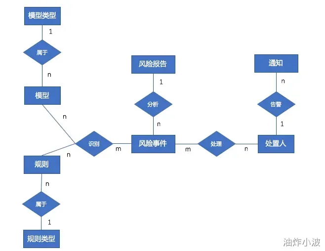 从业务流中,我们可以清晰的定义出 Moment-Interval Archetype (时标性原型),流程中的每个节点符合 MI 的定义,即事物在某个时间段内发生。在 MI 的定义过程中,一种方法是通过名词+动词进行定义。那么,风控的 MI 即为:数据采集、规则 &模型设置、风险识别、告警通知、风险处置、风险分析(MI 使用红色表示)。
