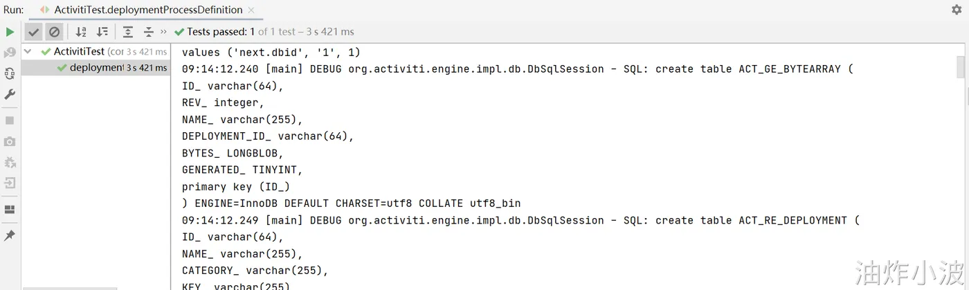 运行单测,会发现日志中打印了大量的DDL语句,这是因为Activiti作为一款成熟的工作流引擎框架,他已经有了完善的数据库:
