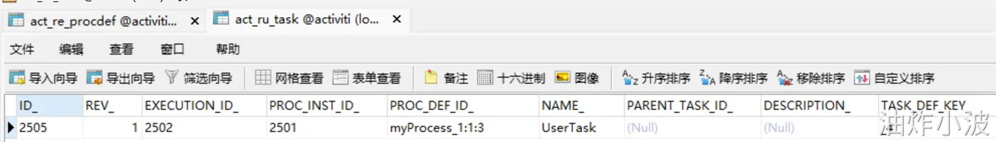 此时我们去:act_ru_task 表中可以看到生成一个新的task数据,即当前用户开启了一个新的流程