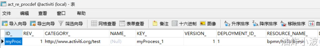 此时,最关键的来了:我们去:act_re_procdef中会发现有我们刚才的流程定义:
