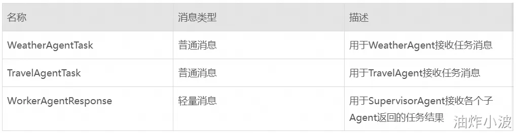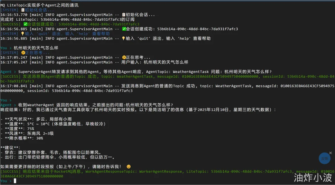 - WeatherAgent 监听到上述消息,执行天气查询,并将结果发往消息队列。