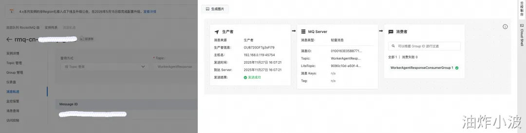 3. 查看消息轨迹:在云消息队列RocketMQ版实例详情页,可以按Topic或按 LiteTopic 查询到相关的消息轨迹。