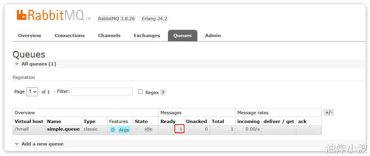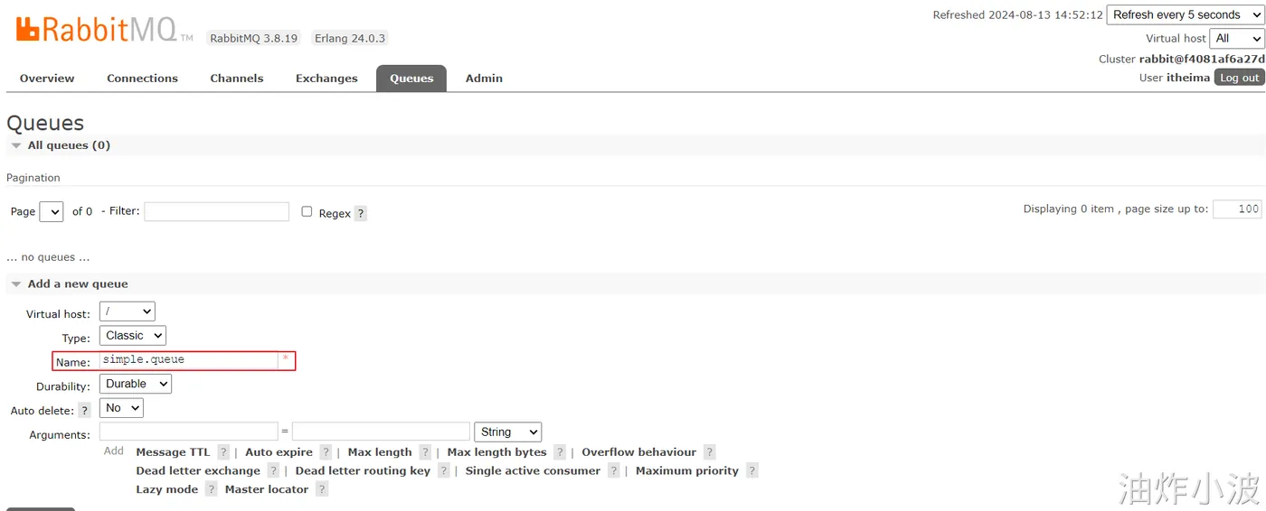 首先进入RabbitMQ控制台创建队列,新建一个队列:simple.queue