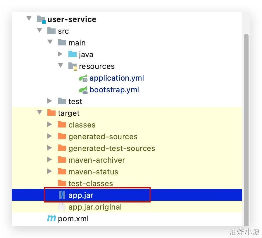 编译打包好的app.jar文件,需要放到Dockerfile的同级目录中。注意:每个微服务的app.jar放到与服务名称对应的目录,别搞错了。