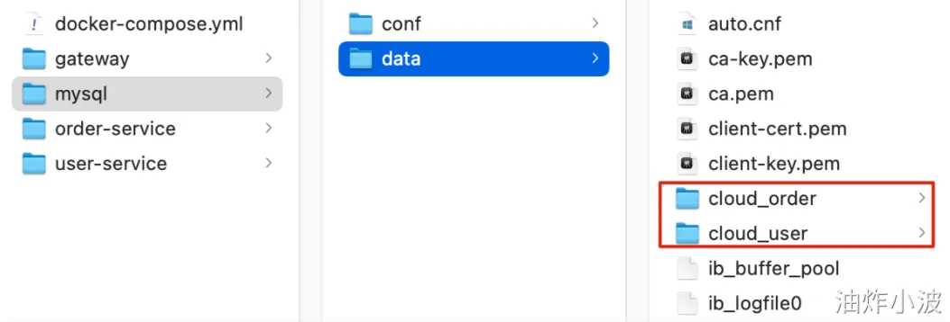 查看mysql目录,可以看到其中已经准备好了cloud_order、cloud_user表:
