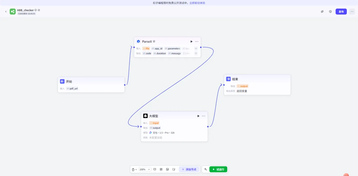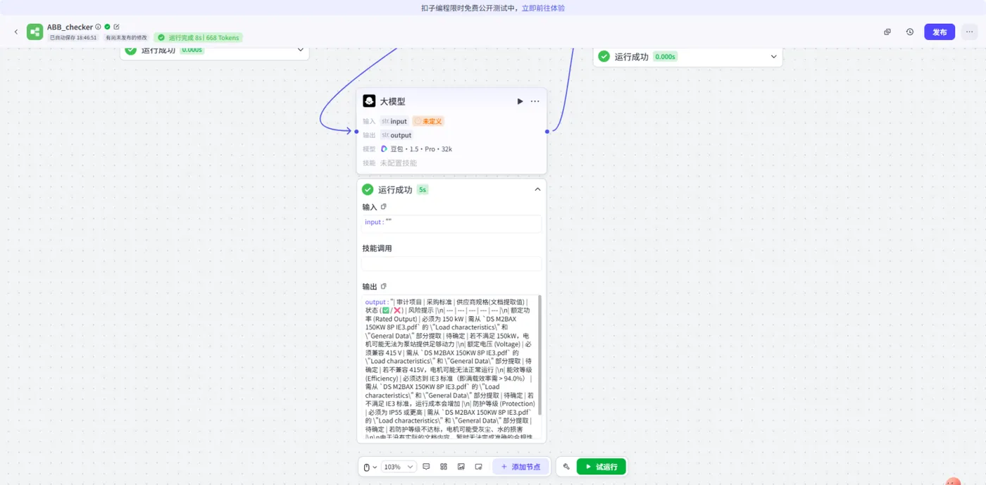我们在 Coze 平台上对“ABB 技术规格审计员”进行了实测,效果如下: