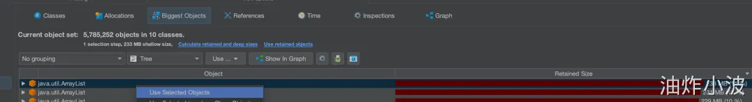 - 首先可以找到最大的对象,一般情况下是大对象引起的full gc。还有一种情况是,不像这么明显是四个大对象,也可能是比较均衡的十几个50mb的对象,具体情况还需要具体分析。
