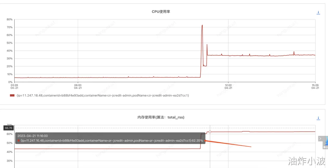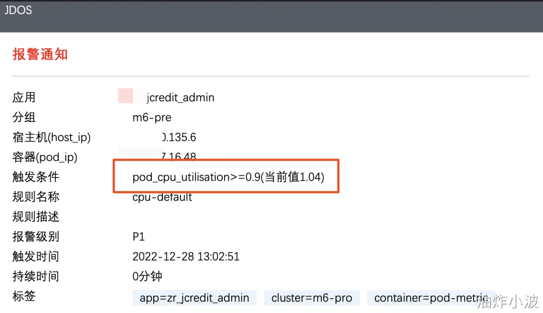 问题起因是我们收到了jdos的容器CPU告警,CPU使用率已经达到104%