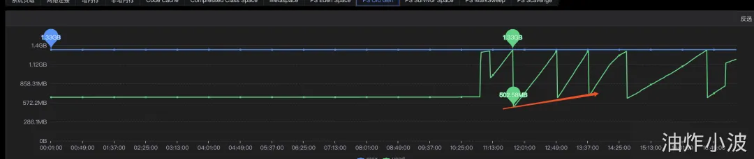 其中一个现象是每次gc后的最小内存正在逐步变大,对应上述步骤中第二步,内存正在逐步膨胀。
