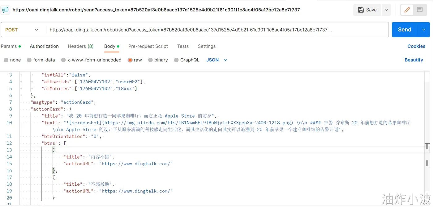 { "at":{ "isAtAll":"false", "atUserIds":["user001","user002"], "atMobiles":["15xxx","18xxx"] }, //链接消息 "link":{ "messageUrl":"1", "picUrl":"1", "text":"1", "title":"1" }, //markdown消息 "markdown":{ "text":"1", "title":"1" }, //feedCard消息 "feedCard":{ "links":{ "picURL":"1", "messageURL":"1", "title":"1" } }, //文本消息 "text":{ "content":"123" }, "msgtype":"text", //actionCard消息 "actionCard":{ "hideAvatar":"1", "btnOrientation":"1", "singleTitle":"1", "btns":[{ "actionURL":"1", "title":"1" }], "text":"1", "singleURL":"1", "title":"1" } }