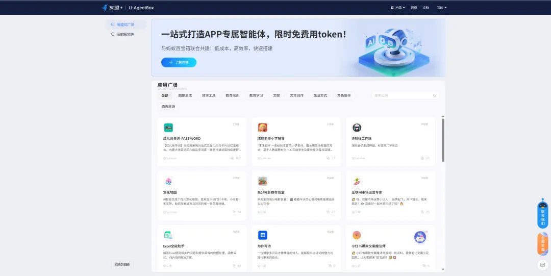 打破跨平台跳转壁垒 —— 开发者在 U-AgentBox(智能体工坊)内可预览、体验覆盖工具、教育、办公等多领域的成熟 Agent 模板,实时感受交互效果与适用场景,决策更直观。