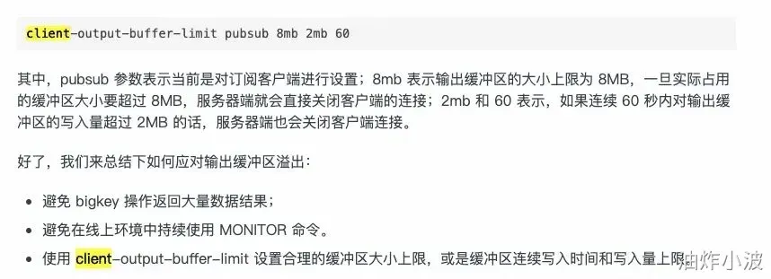 Redis Server 的输出大小通常是不可控制的。存在bigkey的时候,就会产生体积庞大的返回数据。另外也有可能因为执行了太多命令,导致产生返回数据的速率超过了往客户端发送的速率,导致服务器堆积大量消息,从而导致输出缓冲区越来越大,占用过多内存,甚至导致系统崩溃。Redis 通过设置 client-output-buffer-limit来保护系统安全。