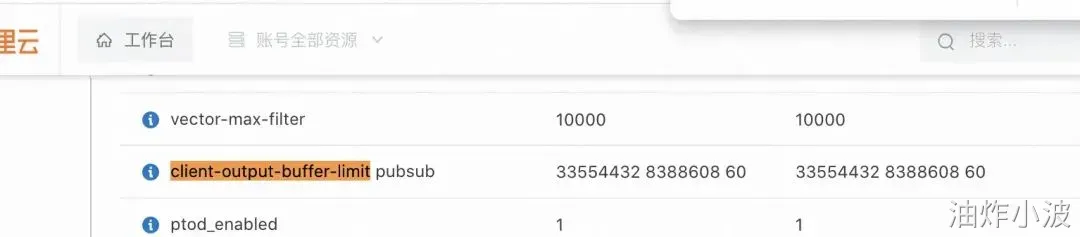 最大输出缓冲区占用=硬限制×连接池最大连接数最大输出缓冲区占用=硬限制×连接池最大连接数=32MB×300=9600MB=9.375GB