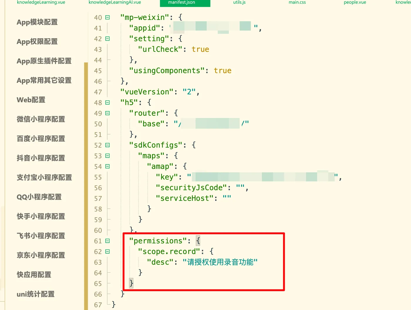 在uni-app开发H5页面时,需要在manifest.json文件中添加录音权限的配置。具体如下: