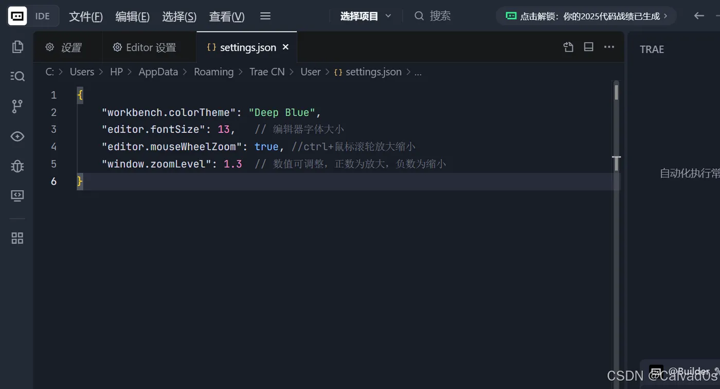 { "workbench.colorTheme": "Deep Blue", "editor.fontSize": 13, // 编辑器字体大小 "editor.mouseWheelZoom": true, //ctrl+鼠标滚轮放大缩小 "window.zoomLevel": 1.3 // 数值可调整,正数为放大,负数为缩小 }