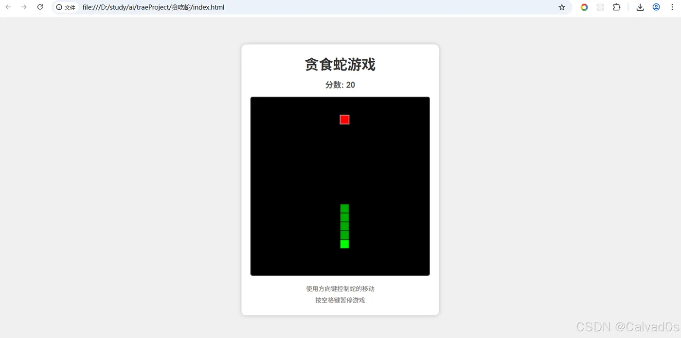 # 1 网页端运行的 贪食蛇小游戏 # 2 如果让一个成手开发写,也要写很久 # 3 使用Trae几分钟完事 # 4 输入提示词: 使用html,css和js帮我写一个贪食蛇项目,写入到: ,并运行
