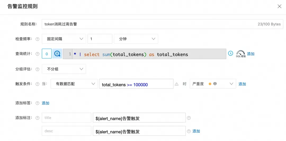 配置告警规则,统计 LLM 节点的 Token 消耗,一旦超过预设阈值,立即触发钉钉/电话告警。