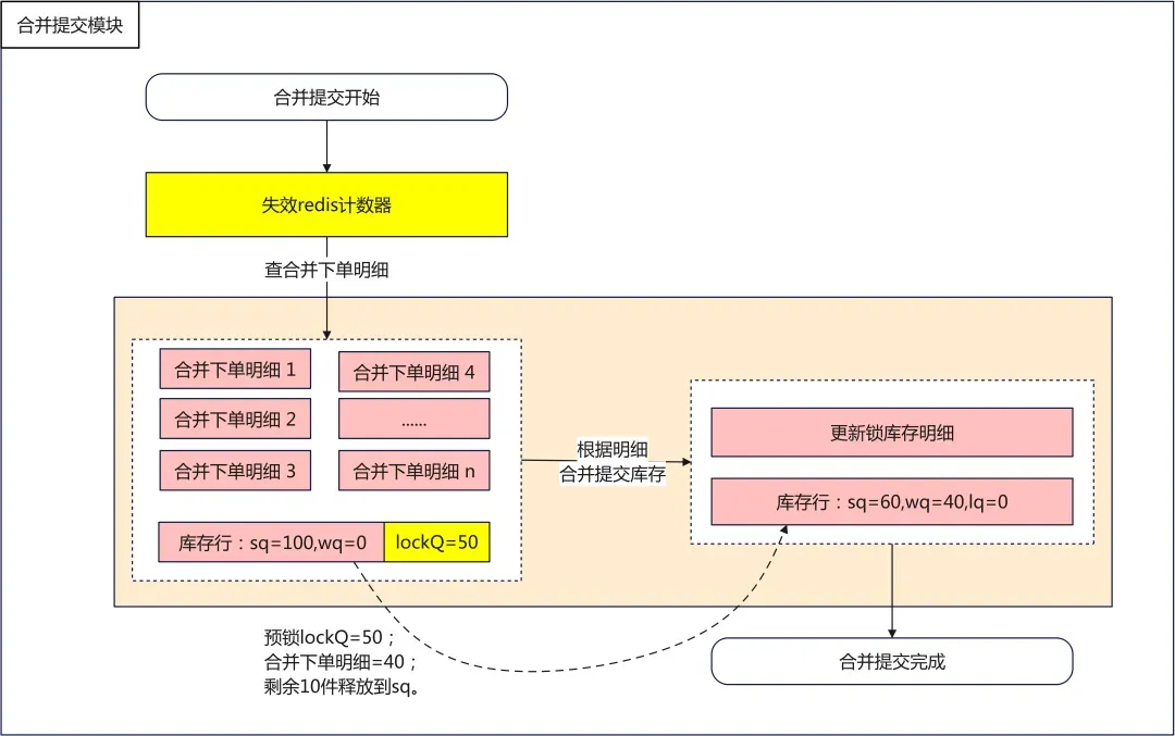 2. 合并扣减下单过程中,先扣减redis库存,redis库存够扣的情况下,再往DB插入扣减明细,明细插入成功最终才算扣减成功;
