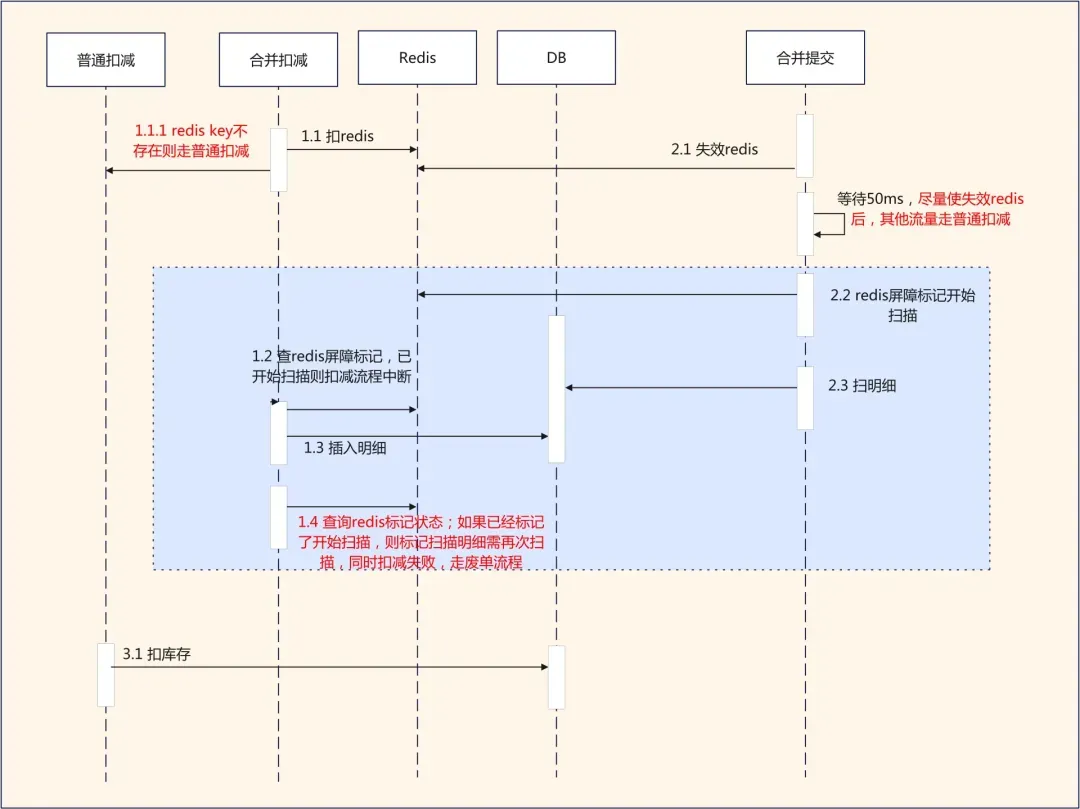 3. 高并发场景下,下单扣减和合并提交单据扫描并发的情况下,可能会出现少扫描了单据,如果少扫描单据了,则会超卖;我们通过Redis扣减屏障防止此并发场景下的超卖;具体链路如下: