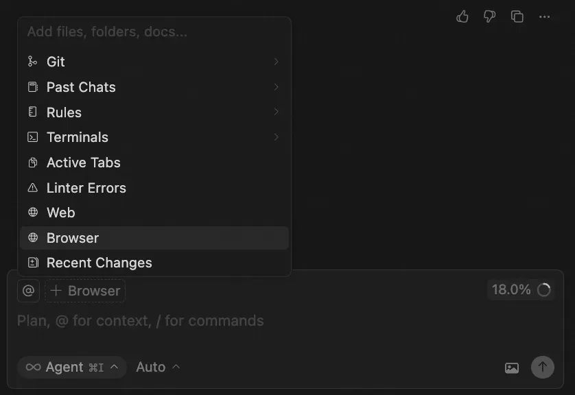 Cursor 新版本对浏览器功能做了升级,原生新增了 Brower Automation 工具,不需要再手动配置相关MCP。它可以直接操作浏览器,对于前端自动化有一定的帮助,下面是官方演示。