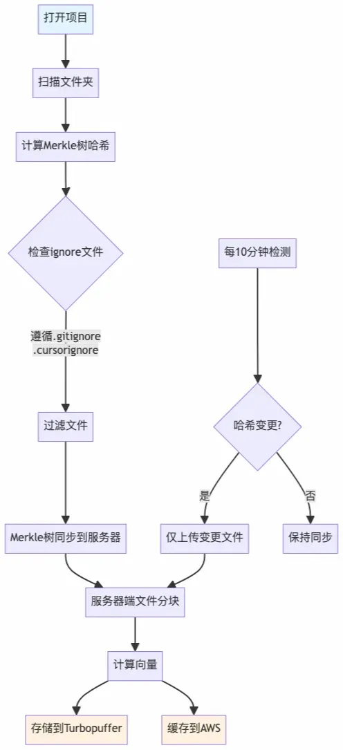 作为一个“Coding”工具,如何理解代码仓库非常重要。Cursor 代码库工具的检索和构建,都是经过 Codebase Indexing 流程实现的,它其实就是在对整个代码仓库做 RAG,即:将你的代码转换为可搜索的向量。