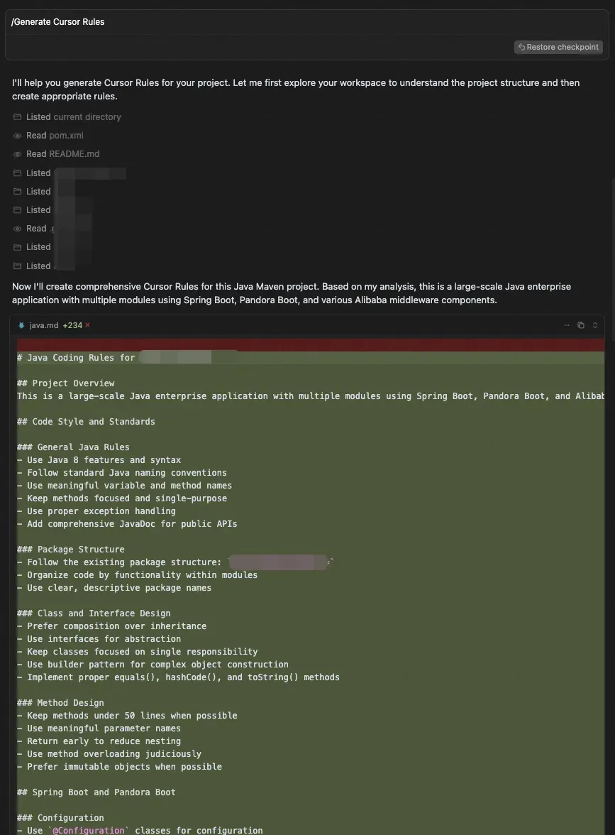 注:使用一套统一的rule,需要统一使用cursor,可能不符合个人习惯。但是在使用其它 AI 编程工具时,维护一个项目规则文档,并在对话时手动添加至上下文,可以达到一样的效果。