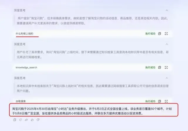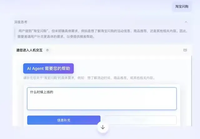 可以看出,用户进入HITL工具进行补充后,工具的出参其实就是用户的输入内容,而用户的这个提问也在一次对话中被完美执行完成,并没有使用多轮对话方式来分两个对话才解决用户的问题。