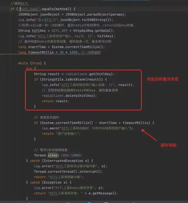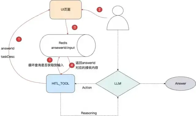 1. HITL工具的执行逻辑中,循环调用Redis,查询key为AnswerId的数据是否有内容,没有内容时,继续循环等待。