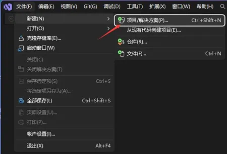 在菜单中依次选择“文件->新建->项目”:
