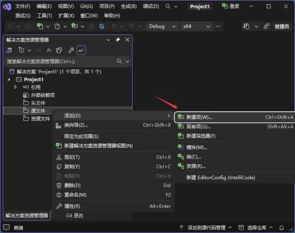 在 “源文件” 处右击鼠标,弹出的菜单中选择 “添加 --> 新建项” ,如下图所示: