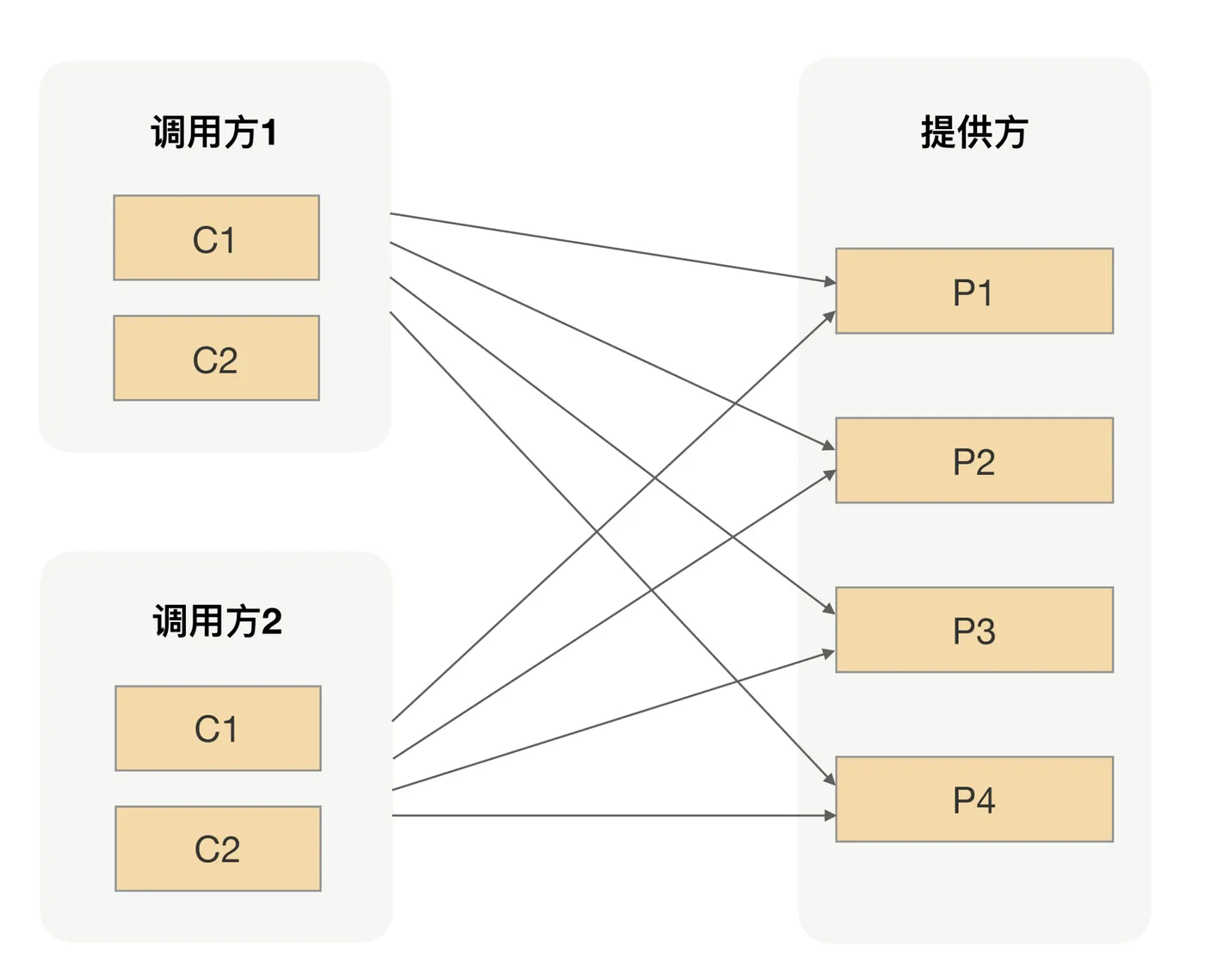 同样的道理,我们用在 RPC 治理上也是一样的。假设你是一个服务提供方应用的负责人,在早期业务量不大的情况下,应用之间的调用关系并不会复杂,请求量也不会很大,我们的应用有足够的能力扛住日常的所有流量。我们并不需要花太多的时间去治理调用请求过来的流量,我们通常会选择最简单的方法,就是把服务实例统一管理,把所有的请求都用一个共享的「大池子」来处理。这就类似于「简单道路时期」,服务调用方跟服务提供方之间的调用拓扑如下图所示: