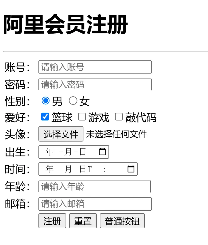 <!DOCTYPE html> <html lang="en"> <head> <meta charset="UTF-8"> <meta name="viewport" content="width=device-width, initial-scale=1.0"> <title>day02/06-表单-登录页面.html</title> </head> <body> <!-- 表单项:就是放在form里面的元素,具体表单项有输入框、按钮等 <input>系列:各种各样的输入框 单行文本输入框:<input type="text" name="给表单元素起名字"> 给表单元素起名字目的是给采集到的数据命名,服务器根据名字区分和接收不同的数据 placeholder="请输入账号" 提示用户输入信息,如果用户输入提示信息隐藏 密码框:<input type="password"> ,输入的数据是不可见的 提交按钮:<input type="submit"> ,点击提交触发让表单中所有采集的数据(表单项)提交给action指定的服务器地址 单选输入框:<input type="radio" name="gender" value="1" checked="checked">男 value是提交给服务器的数据,男是页面展现给用户看的 checked="checked" 设置默认选中 注意:name一样,为一组单选框,一组单选框只能选择一个 多选输入框:<input type="checkbox" name="hobby" value="1" checked="checked">篮球 注意:name要一样,这样后端服务器才可以接收多个值 文件域输入框: <input type="file" name="pic"> 选择客户端文件用于上传给服务器 日期或时间输入框:<input type="date" name="birthday"> 日期框 <input type="datetime-local" name="birthdayTime"> 日期时间框 数字框:<input type="number" name="age" min="1" max="200"> min设置最小数字,max最大数字 电子邮箱框:<input type="email" name="email" placeholder="请输入邮箱"> 提交表单会校验邮箱的格式必须含有@ 重置按钮:<input type="reset"> 重置所有输入数据 普通按钮:<input type="button" value="普通按钮"> 默认没有功能,需要结合javascript技术使用 --> <h1>阿里会员注册</h1> <hr> <form action="#"> <table> <tr> <td>账号:</td> <td><input type="text" name="username" placeholder="请输入账号"></td> </tr> <tr> <td>密码:</td> <td><input type="password" name="pwd" placeholder="请输入密码"></td> </tr> <tr> <td>性别:</td> <td> <input type="radio" name="gender" value="1" checked="checked">男 <input type="radio" name="gender" value="2">女 </td> </tr> <tr> <td>爱好:</td> <td> <input type="checkbox" name="hobby" value="1" checked="checked">篮球 <input type="checkbox" name="hobby" value="2">游戏 <input type="checkbox" name="hobby" value="3">敲代码 </td> </tr> <tr> <td>头像:</td> <td> <input type="file" name="pic"> </td> </tr> <tr> <td>出生:</td> <td> <input type="date" name="birthday"> </td> </tr> <tr> <td>时间:</td> <td> <input type="datetime-local" name="birthdayTime"> </td> </tr> <tr> <td>年龄:</td> <td> <input type="number" name="age" min="1" max="200" placeholder="请输入年龄" style="width: 164.6px;"> </td> </tr> <tr> <td>邮箱:</td> <td> <input type="email" name="email" placeholder="请输入邮箱"> </td> </tr> <tr> <td></td> <td> <input type="submit" value="注册"> <input type="reset"> <input type="button" value="普通按钮"> </td> </tr> </table> </form> </body> </html>