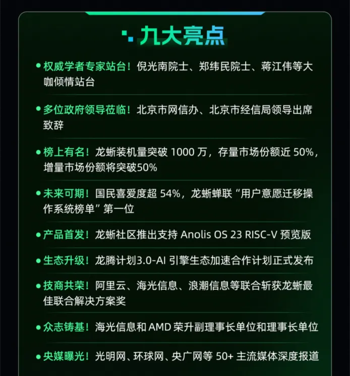 会议伊始,龙蜥社区运营委员会主席陈绪做开场发言。他回顾了社区在市场占有、生态和开源影响力等方面的成果,特别强调龙蜥社区已成为支撑中国智能计算基础设施的核心开源力量。同时,他也在会上为大家解读了 2025 年龙蜥操作系统大会成果。总的来说,这是一次成功的大会,为龙蜥在关键技术如云原生、尤其是 RISC-V 和 AI 方向的生态建设和产业协同奠定了坚实基础。本次会议主要成果和亮点见下图: