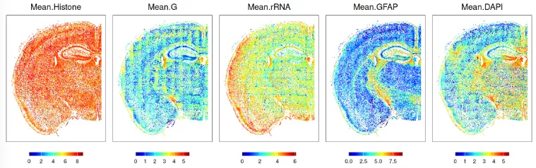 最后,成像类平台除转录本数据外,还附带形态学信息(如分割细胞的面积与偏心率)以及抗体染色信息(如靶向细胞核或膜表面的染色)。