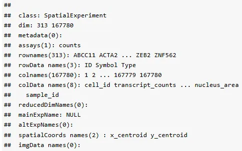为了把 CosMx 数据加载成 SpatialExperiment 对象,我们使用 SpatialExperimentIO 的 readCosmxSXE 函数。为了避免 RNA 靶标计数与阴性探针或系统对照产生的计数混淆,后者默认被移入 altExps。我们还会额外添加 ggspavis(用于可视化)和 SpaceTrooper(用于分析)所需的 colData 和 metadata 槽。SpaceTrooper 的 updateCosmxSPE 函数会负责将对象的 colData 标准化,以便与 SpaceTrooper 的函数配套使用。