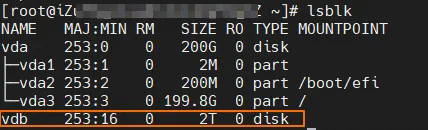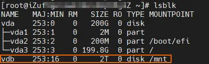 lsblk命令,查看数据盘已挂载至/mnt目录下。
