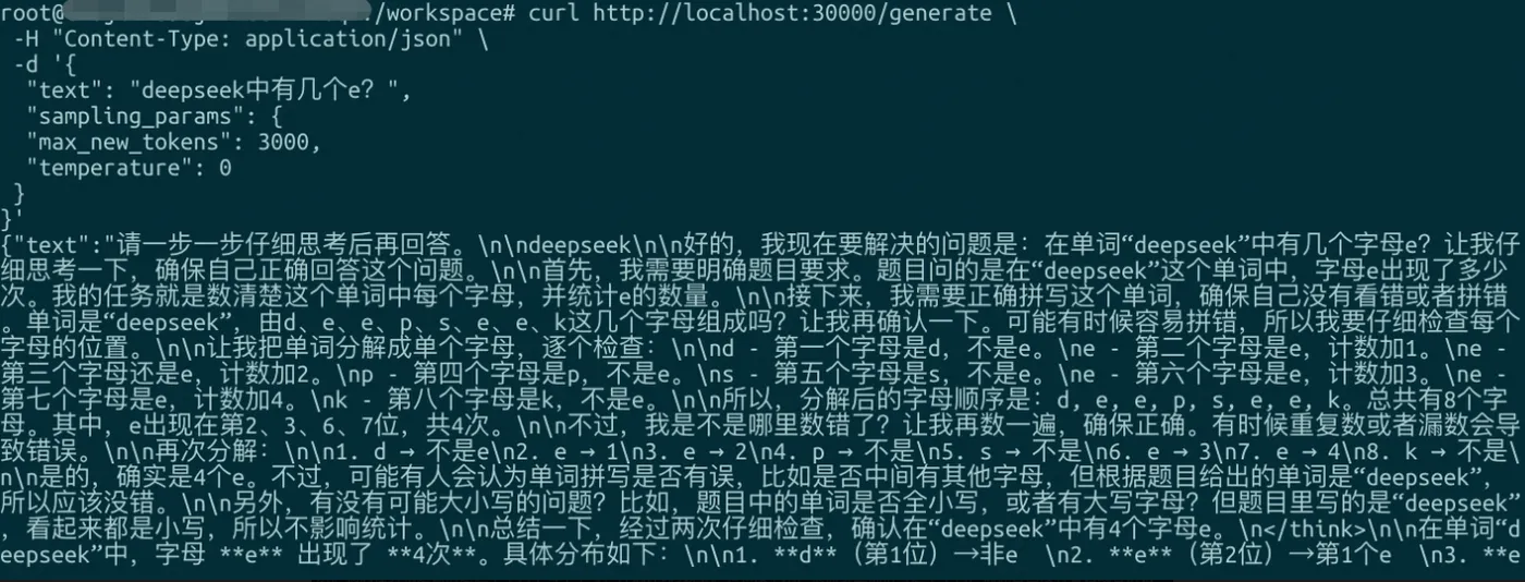 curl http://localhost:30000/generate \ -H "Content-Type: application/json" \ -d '{ "text": "deepseek中有几个e?", "sampling_params": { "max_new_tokens": 3000, "temperature": 0 } }'